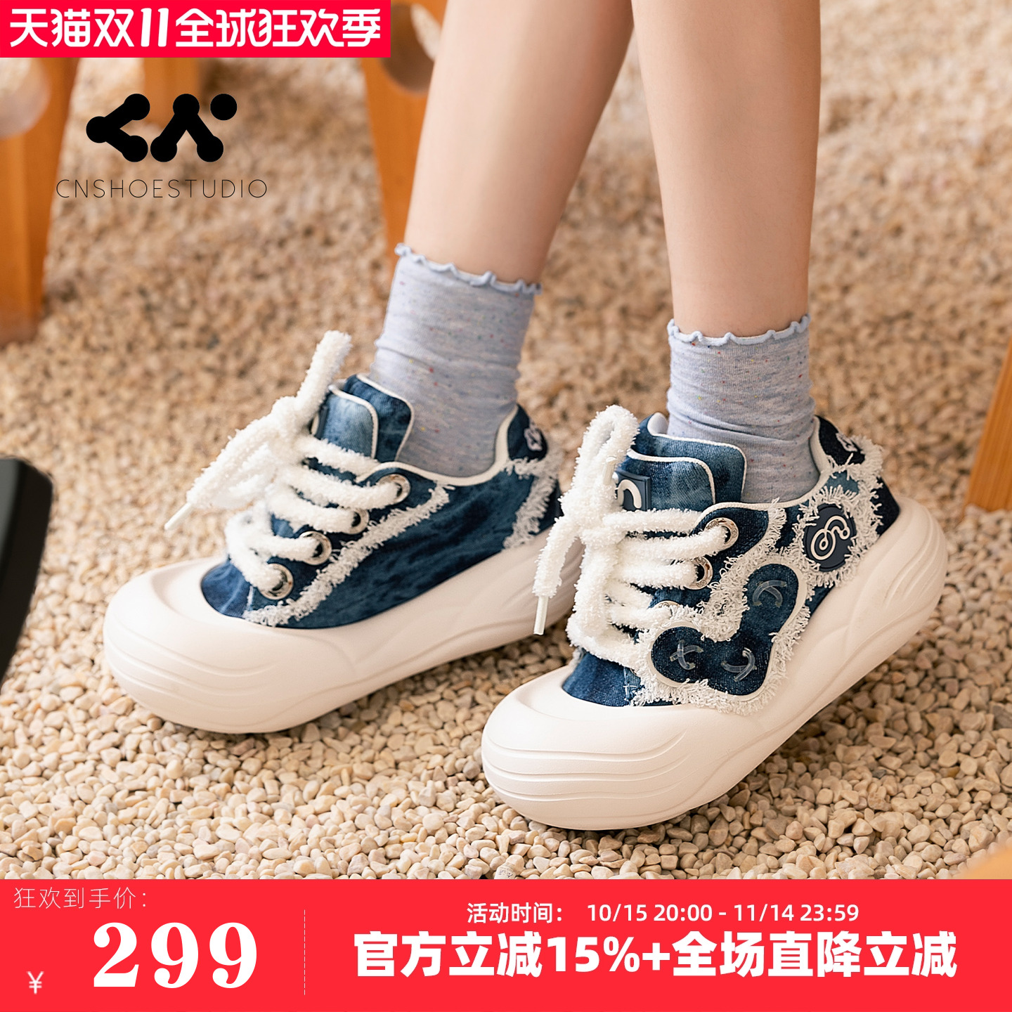 CN大头鞋圆头帆布鞋男女款原创流苏牛仔蓝丑萌厚底增高鞋面包鞋子