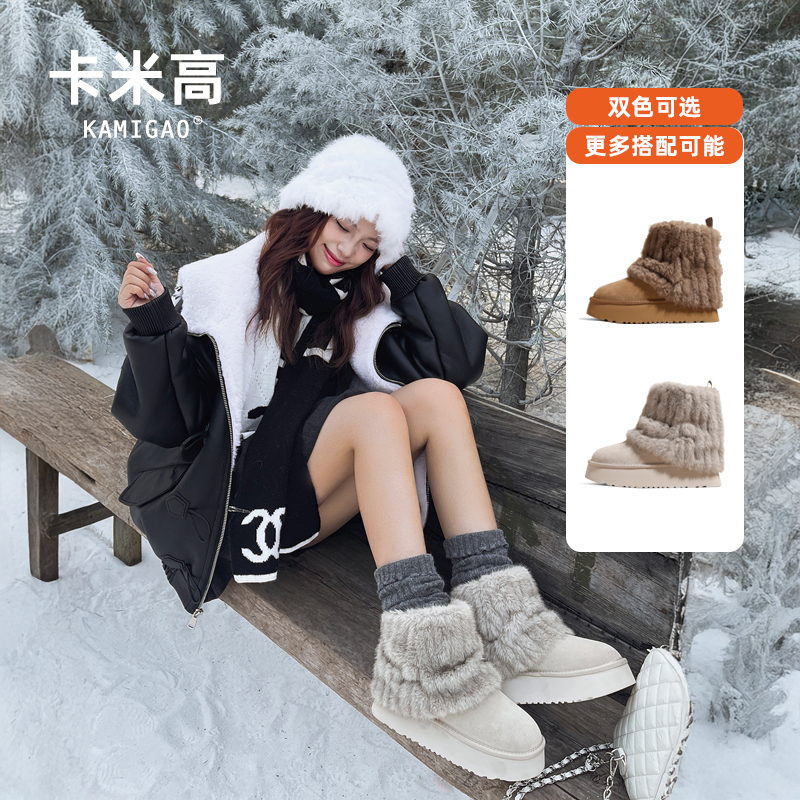 卡米高8cm内增高雪地靴女款冬季新款毛毛短靴小个子棕色厚底棉鞋