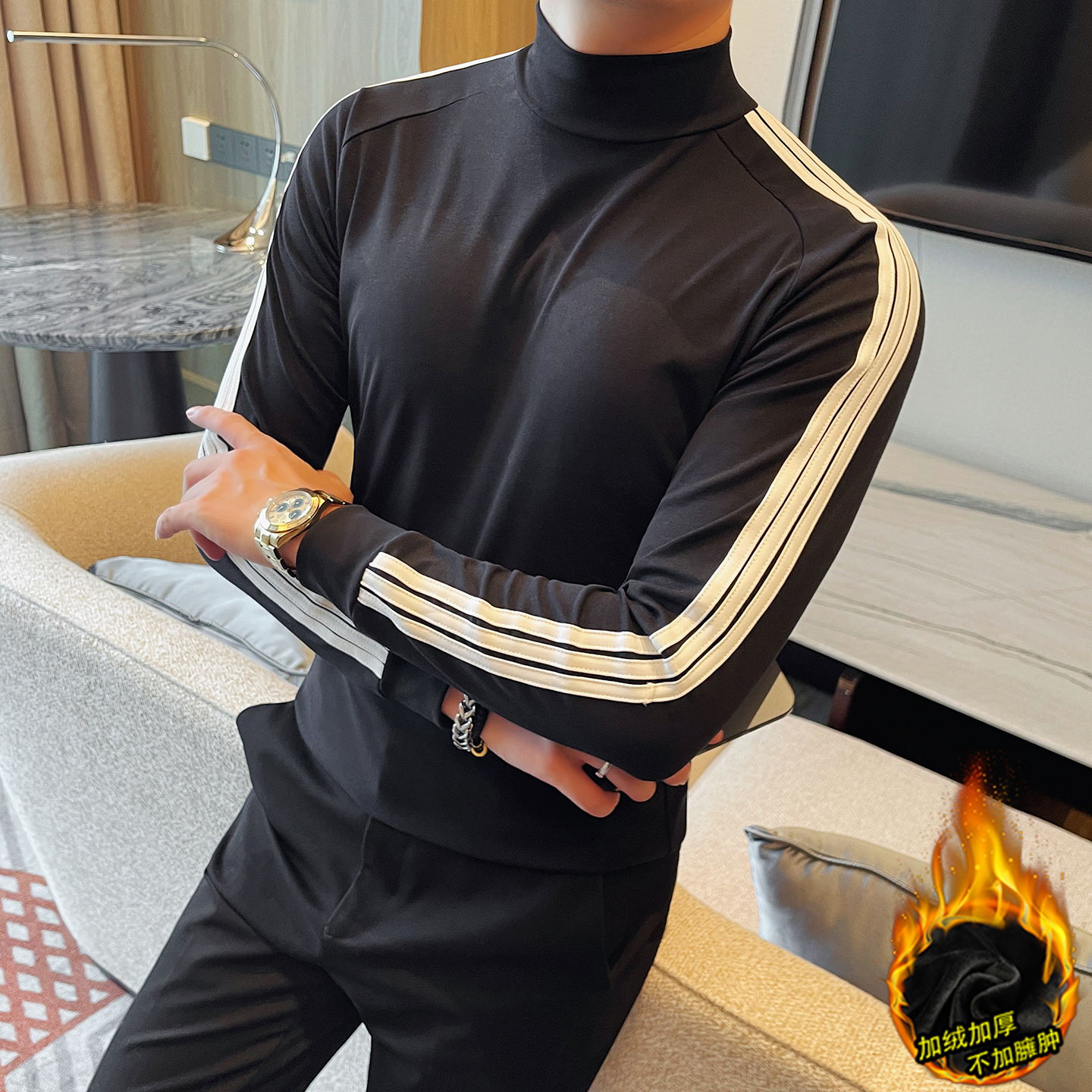 条纹织带拼接半高领T恤男长袖秋冬季加绒加厚潮流修身中领打底衫