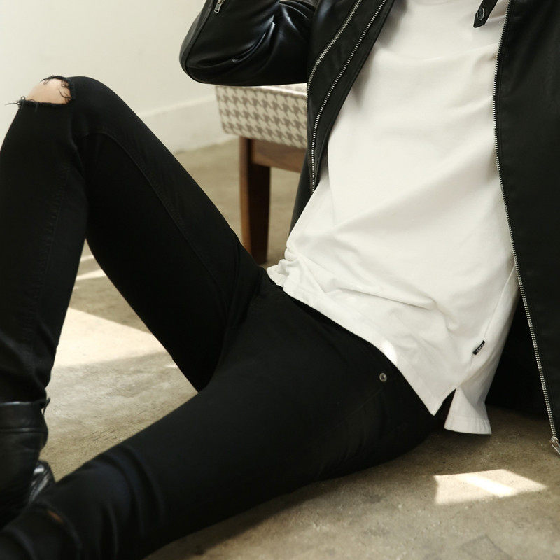 男生高弹力小脚裤子黑色膝盖破洞 修身牛仔裤 潮男修身乞丐铅笔裤
