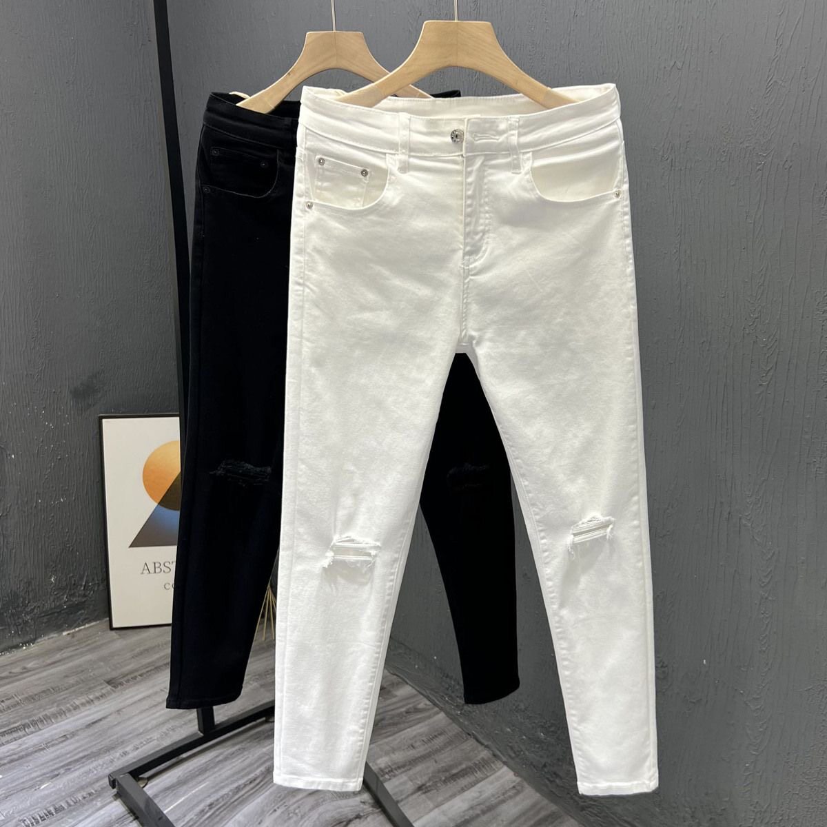 白色九分牛仔裤男修身小脚一字膝盖破洞男士裤子新款夏季弹力薄款