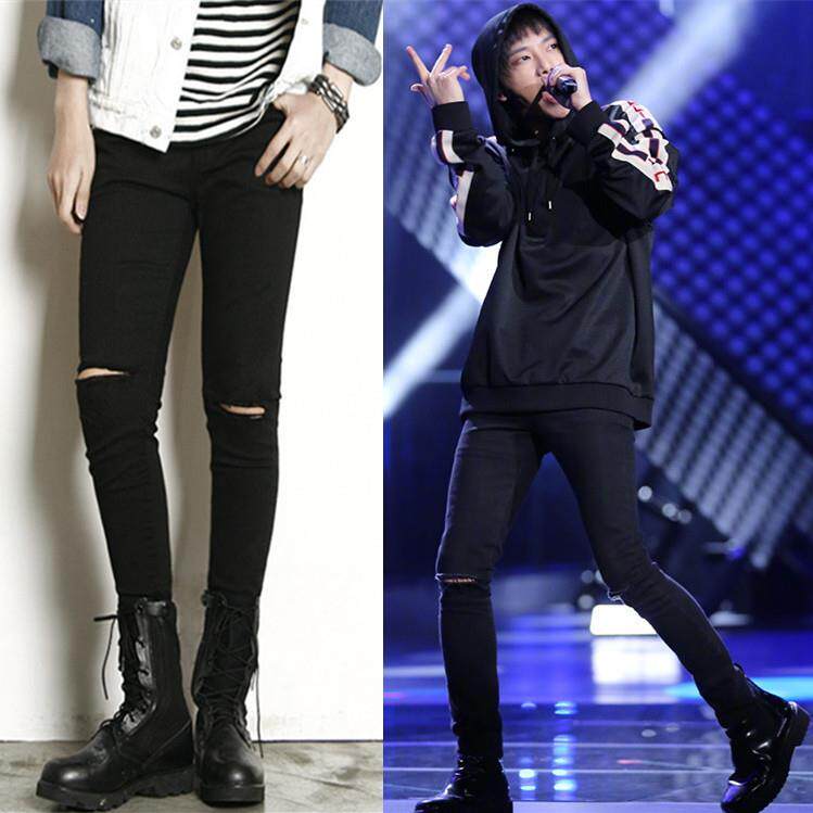 EXO权志龙同款JEANS高街潮男膝盖破洞小脚牛仔裤刀割弹力乞丐裤子