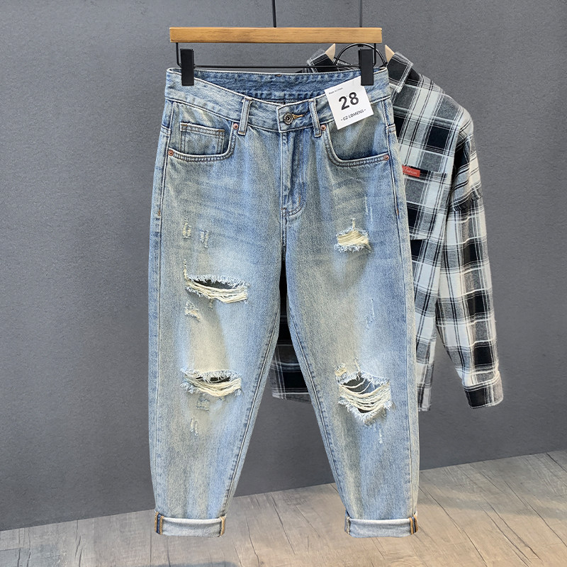 膝盖破洞小脚九分牛仔裤男个性烂裤脚切边乞丐裤浅色复古修身裤子