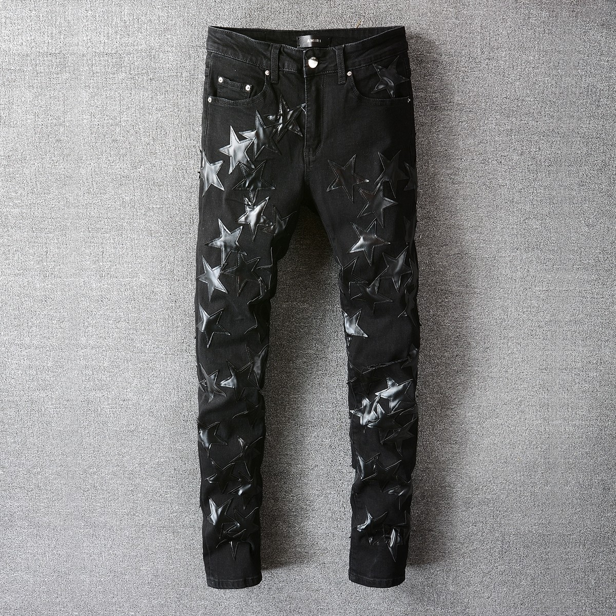 AMR JEANS 美式高街风潮牌星星拼皮膝盖刀割破洞修身黑色牛仔裤男