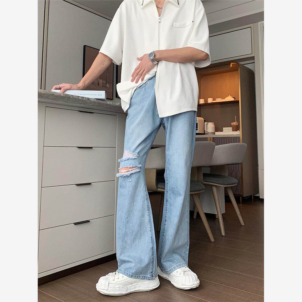 美式vibe高街膝盖破洞牛仔裤男春新款设计感显瘦裤子直筒微喇叭裤