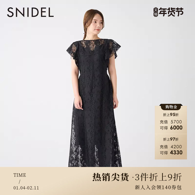 SNIDEL秋冬优雅一字领荷叶边收腰系带露背蕾丝连衣裙SWFO234102