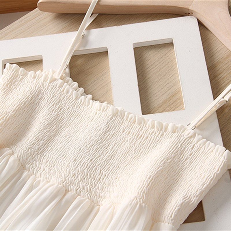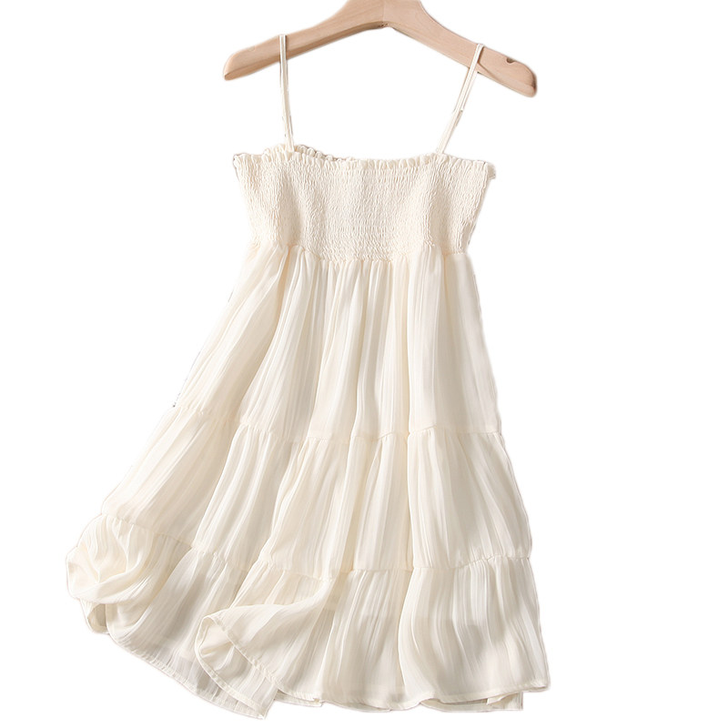 法式一字领白色薄纱短吊带连衣裙女夏小个子气质叠层荷叶边短裙子