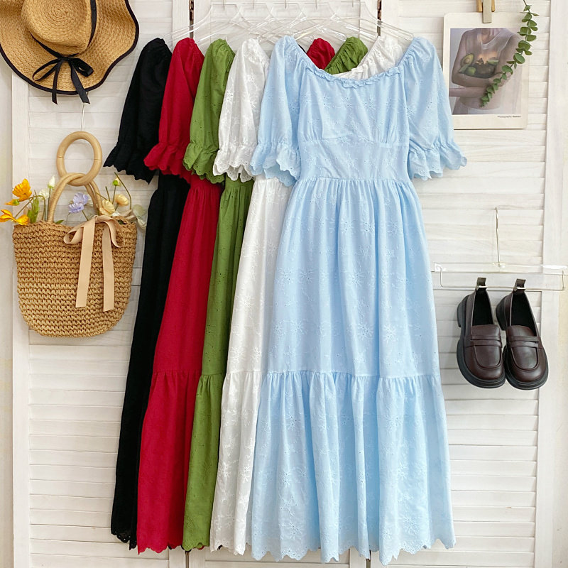 法式度假风一字领镂空钩花收腰显瘦荷叶边中长款连衣裙女2026新款