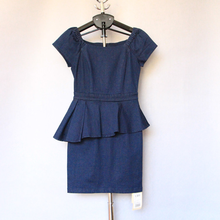 摩系列2018夏新品一字领短袖荷叶边修身牛仔连衣裙包臀短裙一步裙