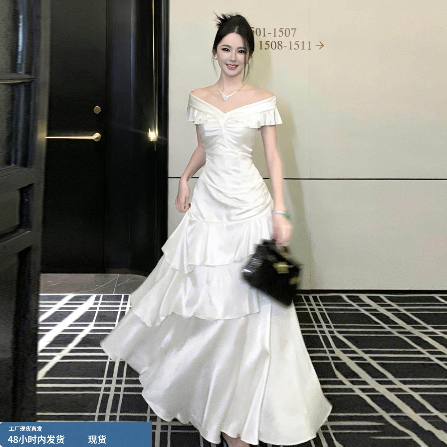 千金感穿搭v领缎面荷叶边一字肩宴会连衣裙出席重要场合漂亮裙子