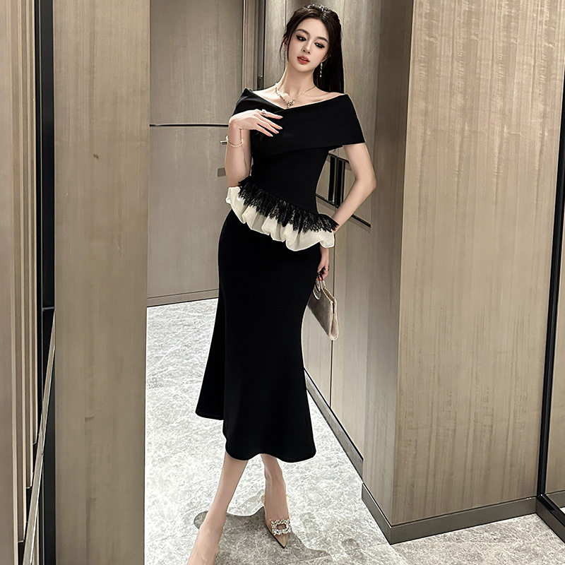 明星同款一字领荷叶边撞色拼接挂脖系带收腰长款鱼尾连衣裙礼服裙