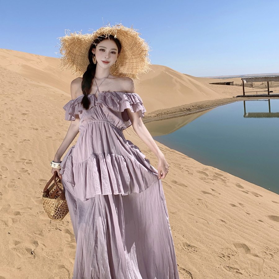 海边度假裙沙滩裙雪纺裙荷叶边一字领露肩显白女小个子穿的连衣裙