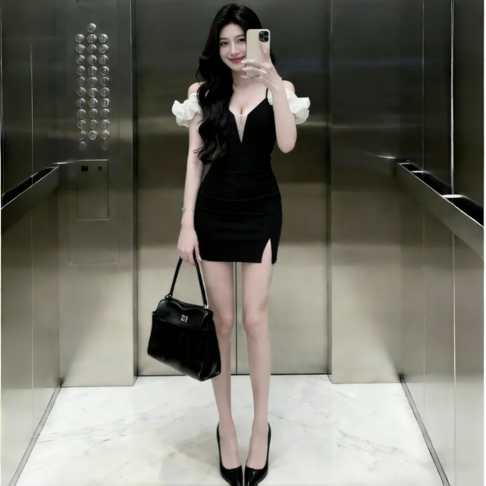 一字领荷叶边袖黑色露肩连衣裙女修身显瘦开叉包臀裙气质减龄约会