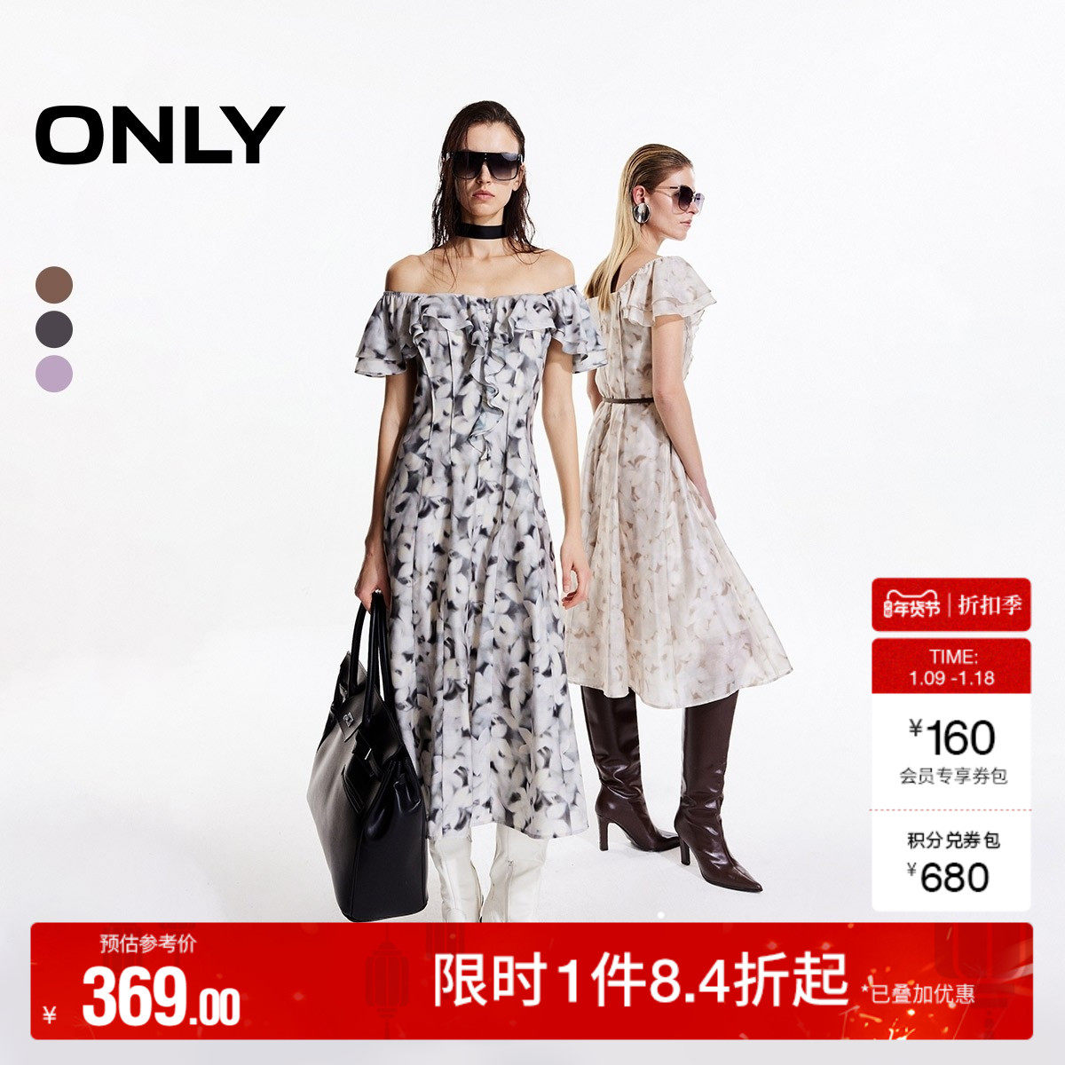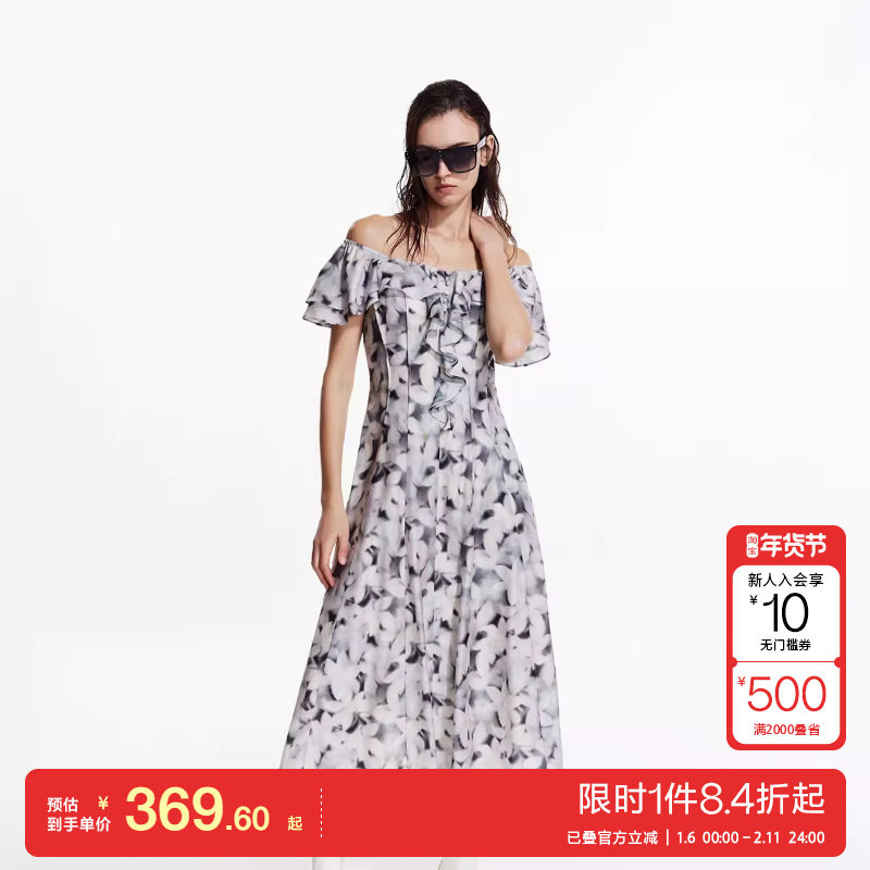 ONLY2025秋冬新款花卉印花甜美法式荷叶边袖一字领中长款连衣裙女