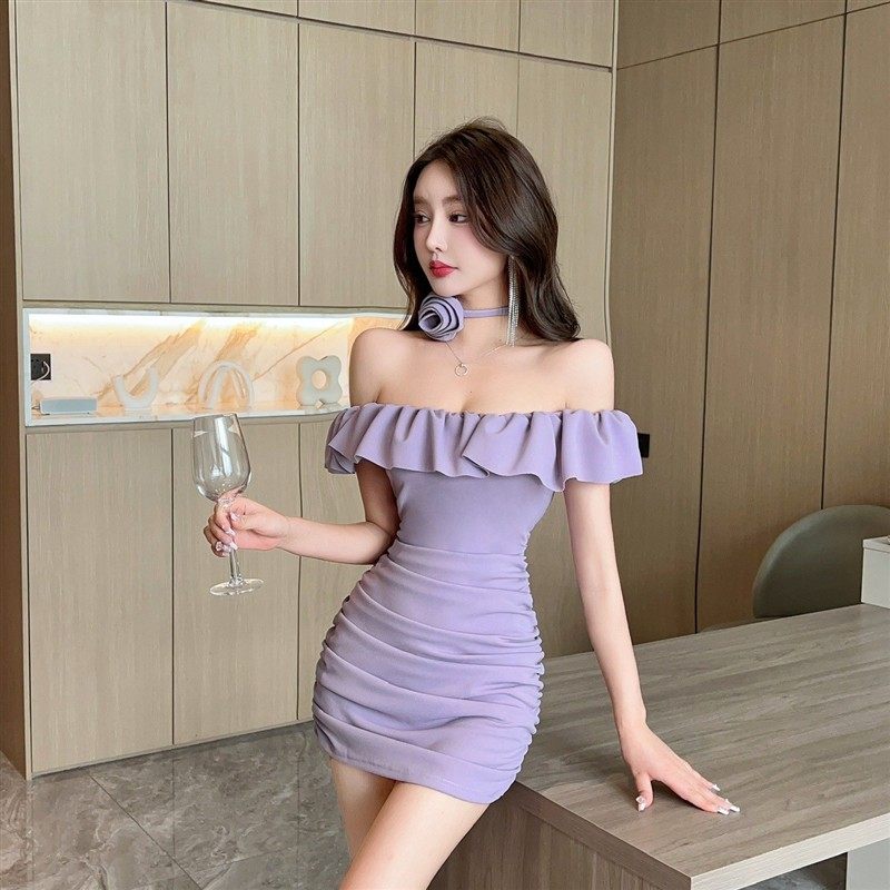 性感荷叶边一字领褶皱修身连衣裙法式高级感气质辣妹显瘦包臀短裙