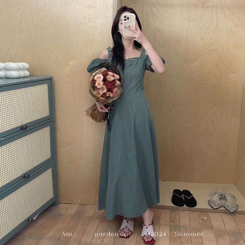 韩国chic夏季复古优雅一字领露肩拼接荷叶边收腰显瘦牛仔连衣裙女