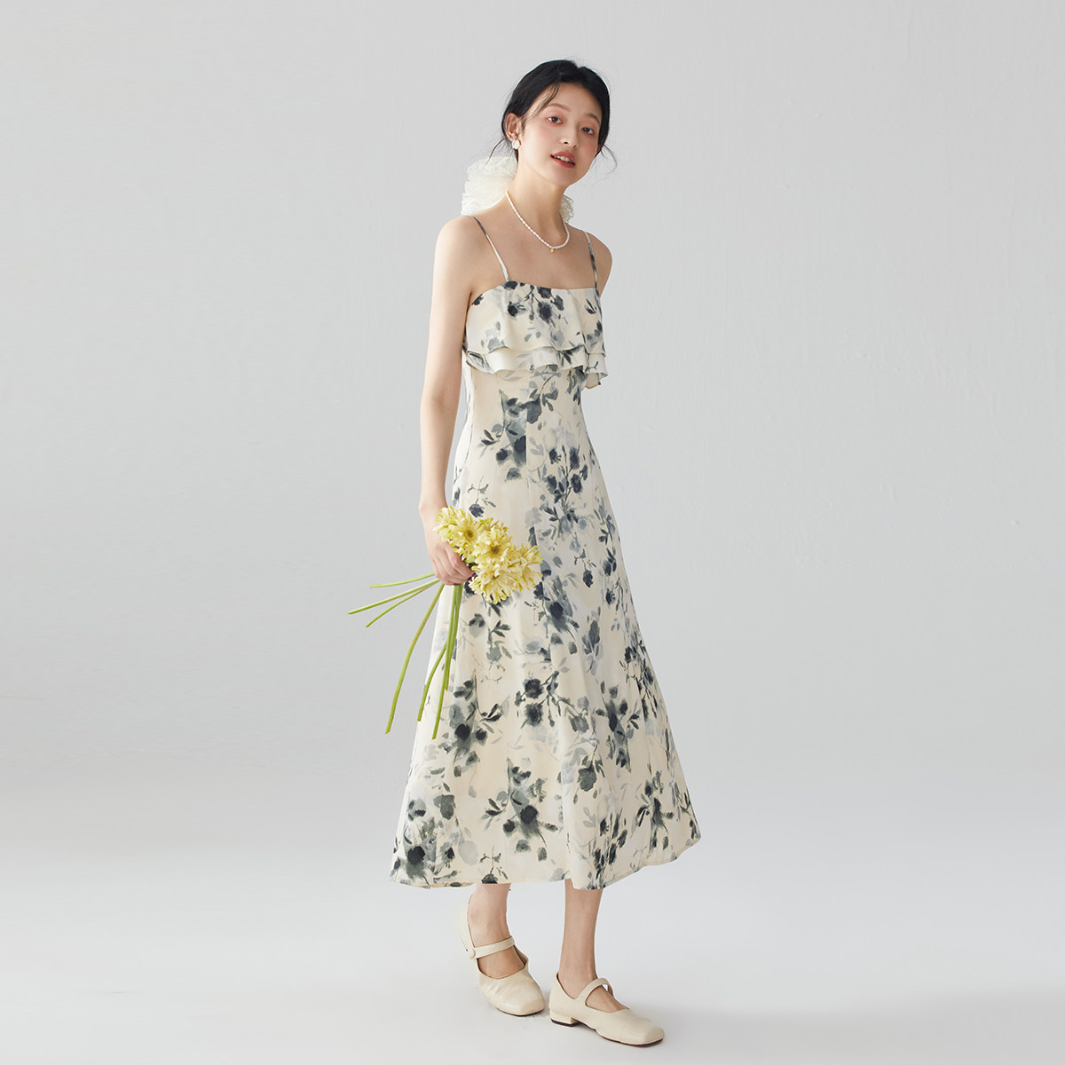 一字领碎花吊带连衣裙女2025夏季新款高级感荷叶边抹胸度假裙子