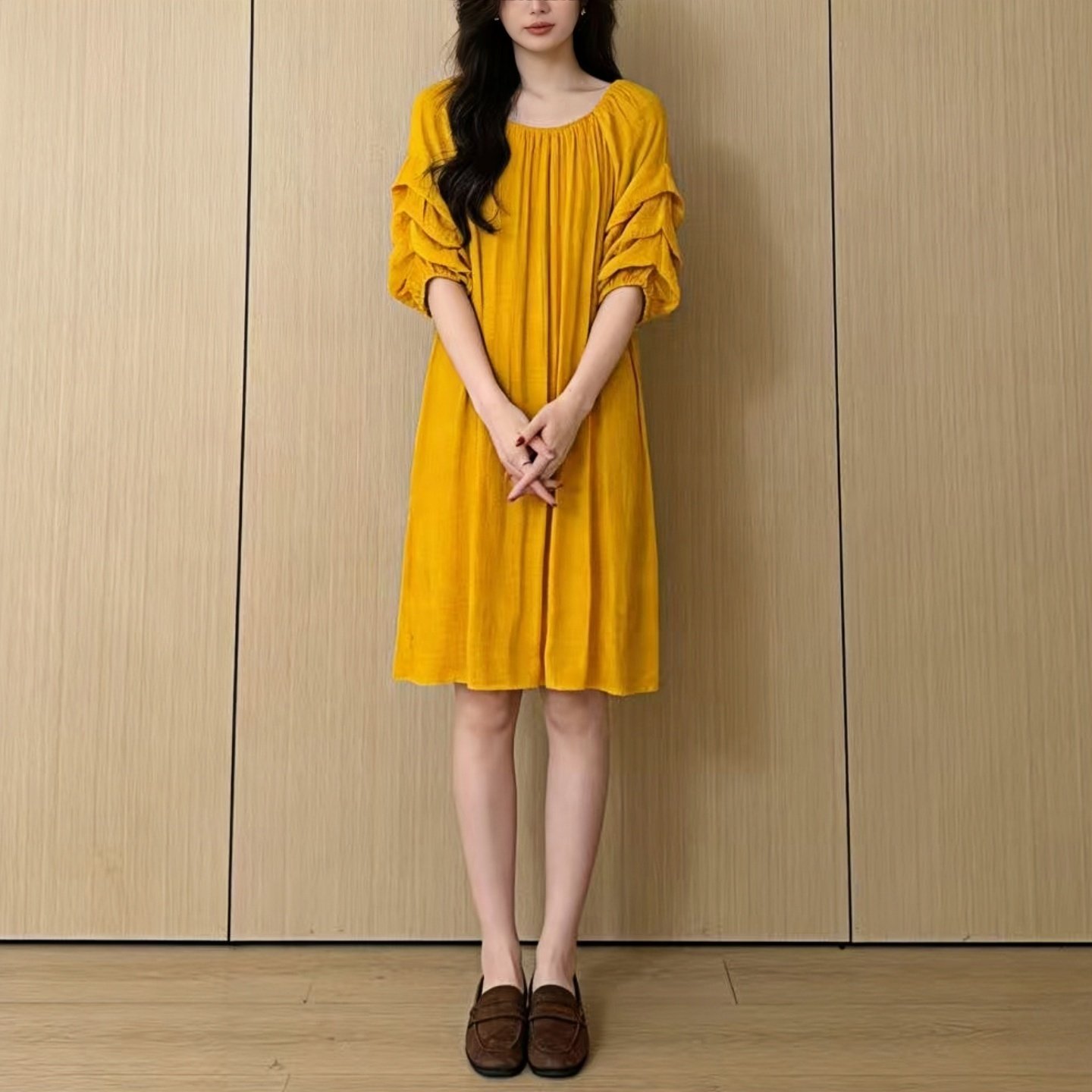 2026春夏一字领简约风中长连衣裙女 宽松显瘦荷叶边泡泡袖A字裙