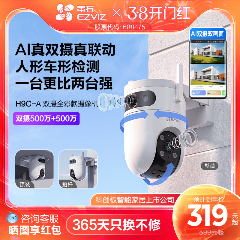 萤石H9c室外双摄云台AI网络摄像头家用手机远程智能监控全景夜视