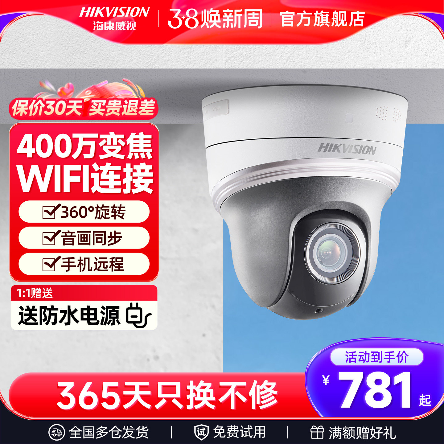 海康威视无线wifi监控摄影头家用手机远程室外高清防水全景摄像头