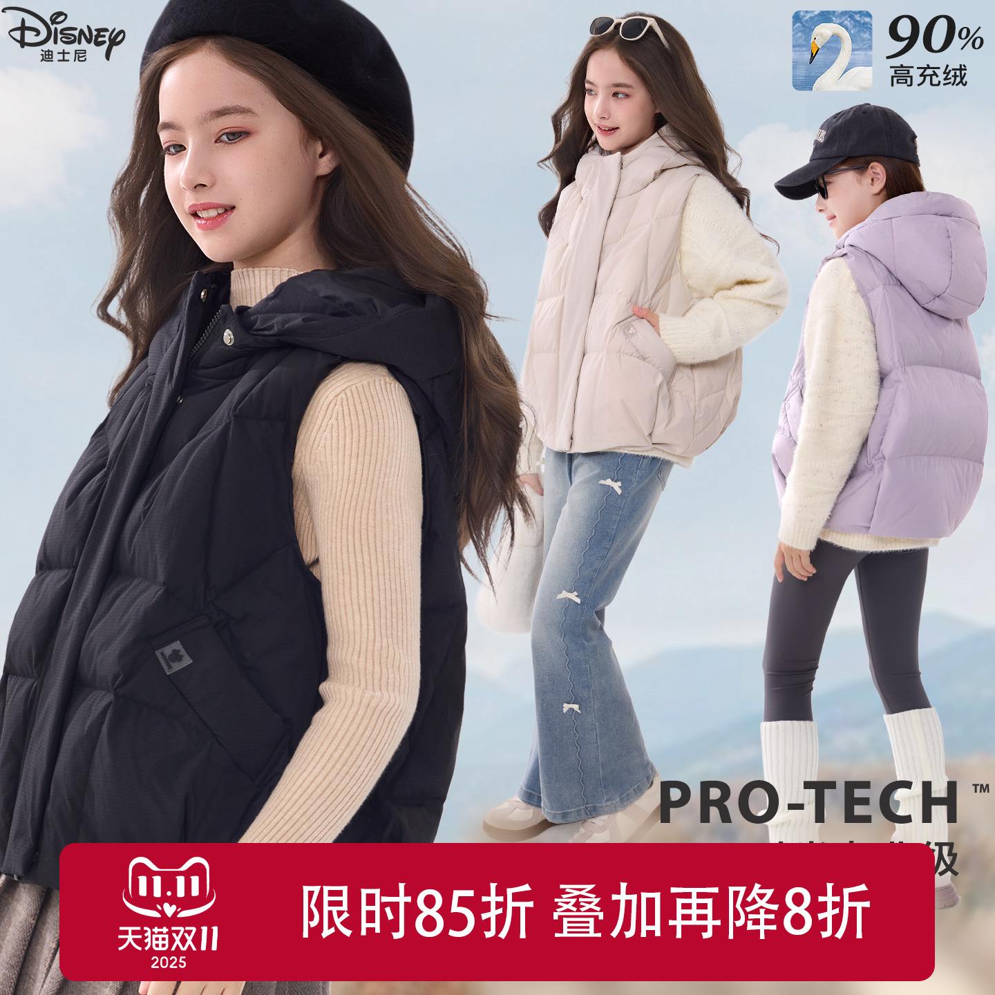 迪士尼女童羽绒马甲冬装2025新款儿童连帽休闲外搭青少年保暖童装