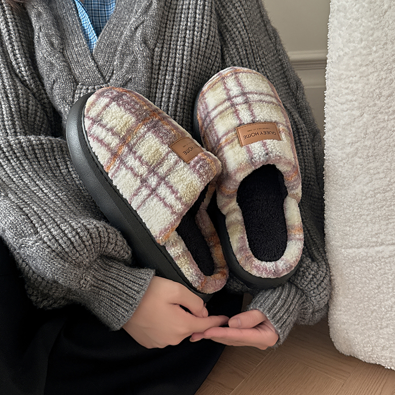 出口秋冬情侣包头拖鞋女男士大码格子加绒橡胶厚底防滑居家用棉拖