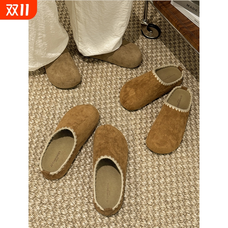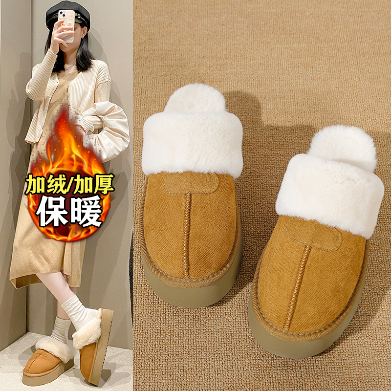 喜番SHOP秋冬加绒包头拖鞋女保暖厚底防滑毛绒棉鞋复古外穿毛毛鞋