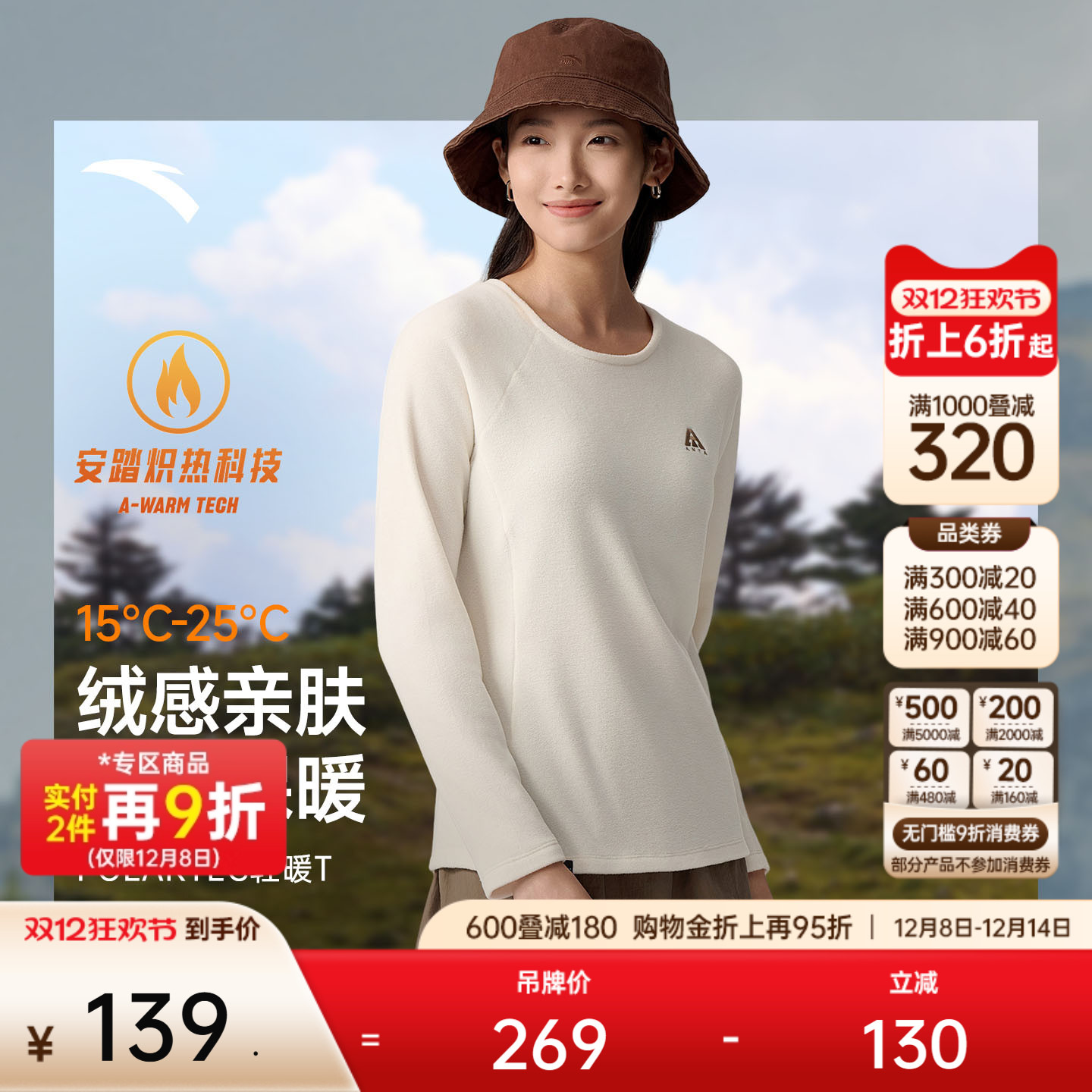 安踏轻暖T丨大地之壳户外抓绒衣女士冬季格绒保暖长袖t恤运动上衣
