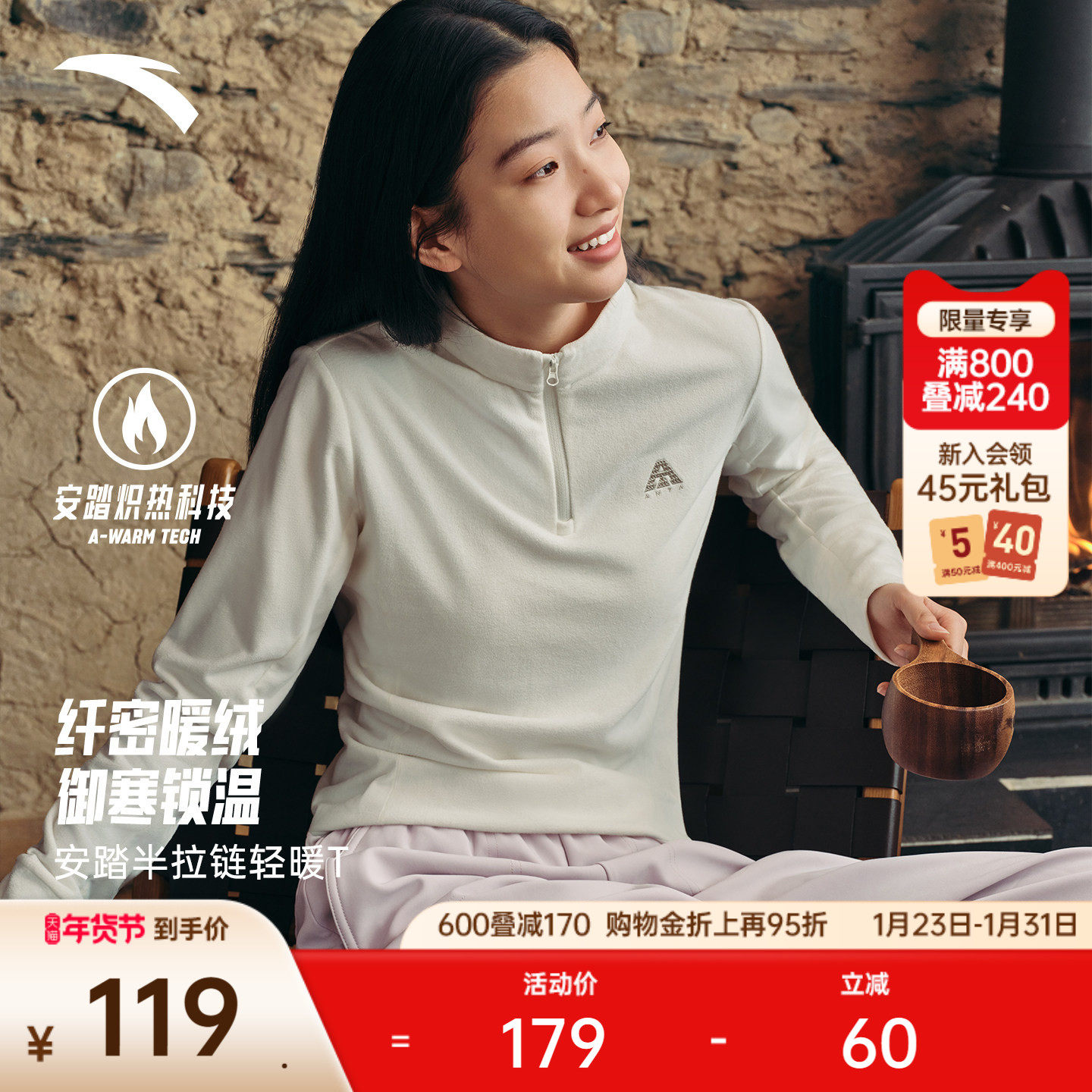 安踏轻暖T丨大地之壳保暖抓绒衣女装冬季新款户外打底衫内搭长袖