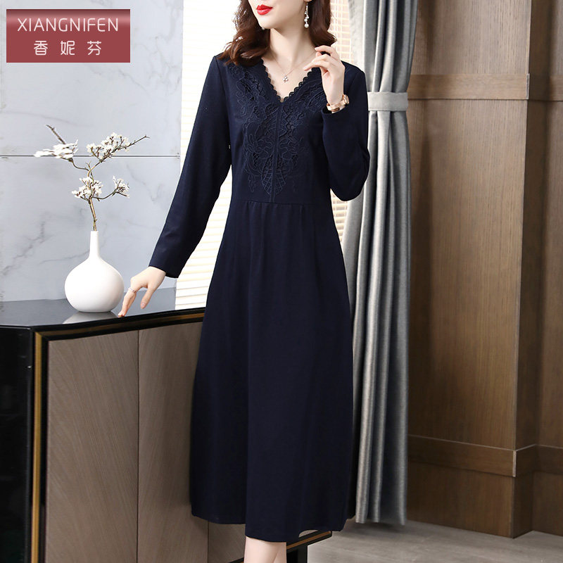 中年高贵优雅气质连衣裙春秋新款拼接显瘦长款V领针织a字裙265