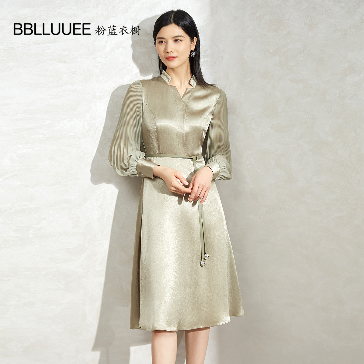 【光感醋酸缎面】粉蓝衣橱高贵优雅气质连衣裙女2025秋装V领长裙