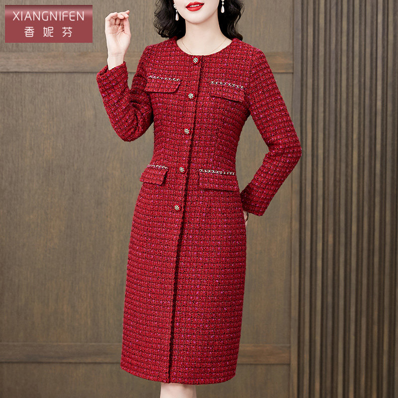 香妮芬红色高贵优雅气质中年妈妈立领长袖连衣裙2025秋季新款显瘦