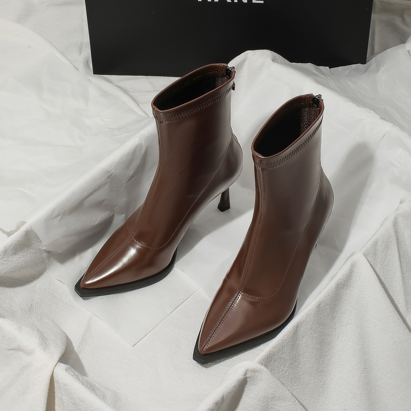 星期六尖头短靴女冬季2025新款棕色细跟踝靴气质高跟靴马丁瘦瘦靴
