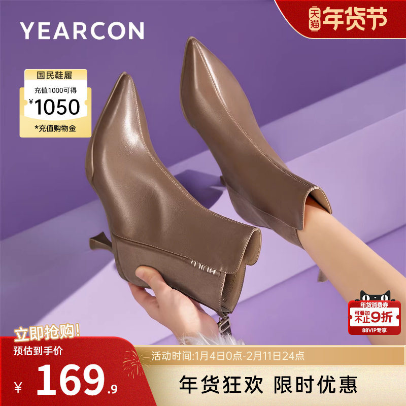 意尔康女鞋冬季加绒短靴尖头细跟法式气质显瘦复古及踝靴女士皮鞋