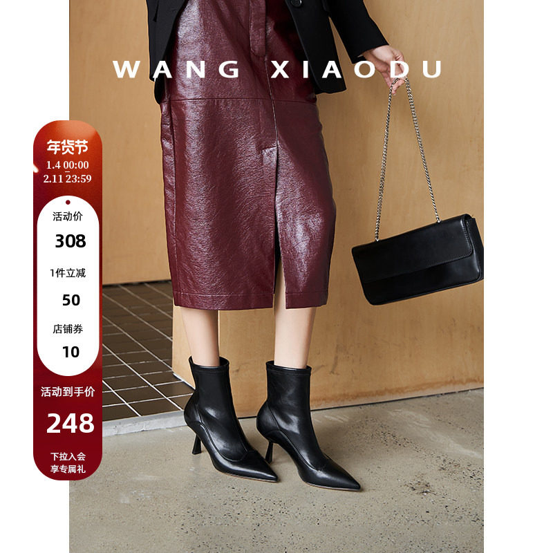 千百度复古羊皮超高跟时装靴女2025冬季新款细跟短靴尖头弹力袜靴