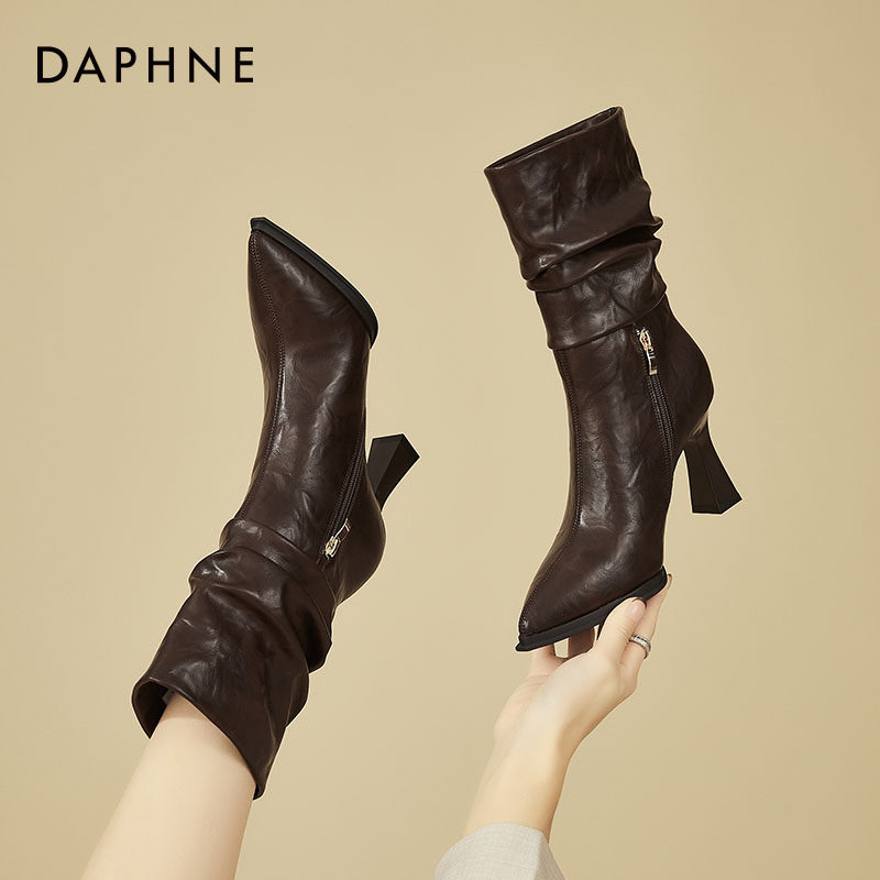 达芙妮尖头高跟短靴女2026秋冬季加绒小个子细跟高跟鞋褶皱堆堆靴