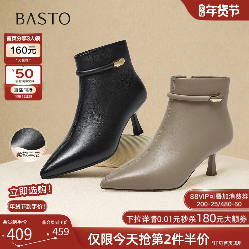 百思图2025冬季商场新款气质羊皮及踝靴尖头细跟女短靴K5035DD5