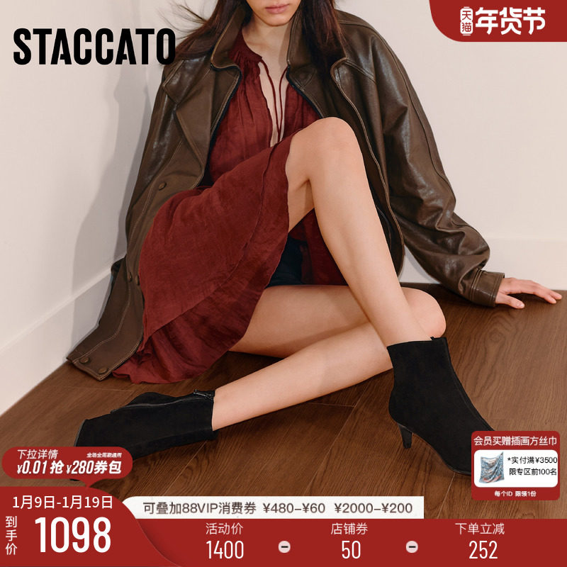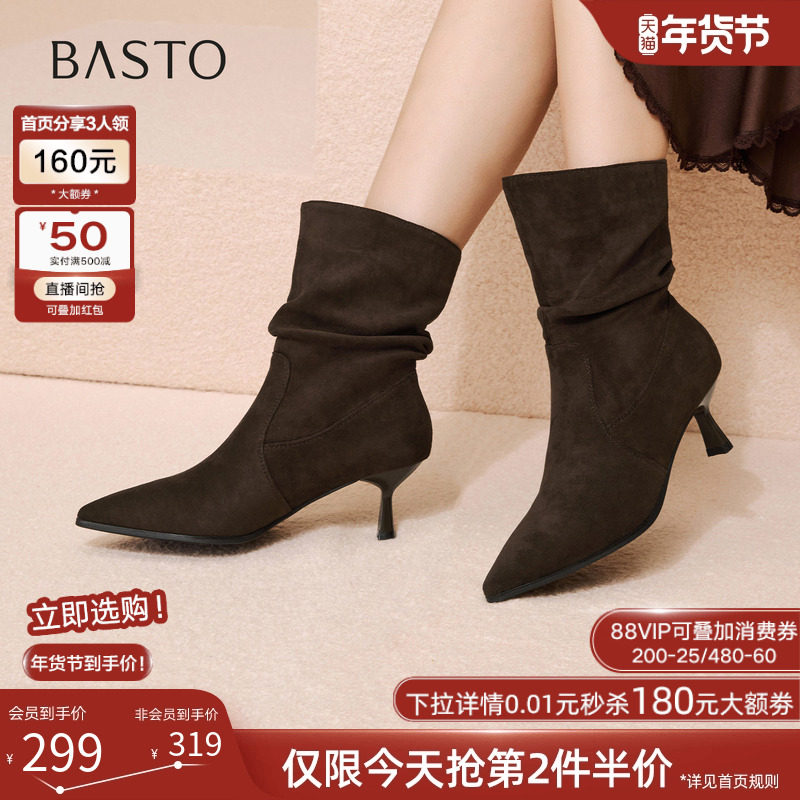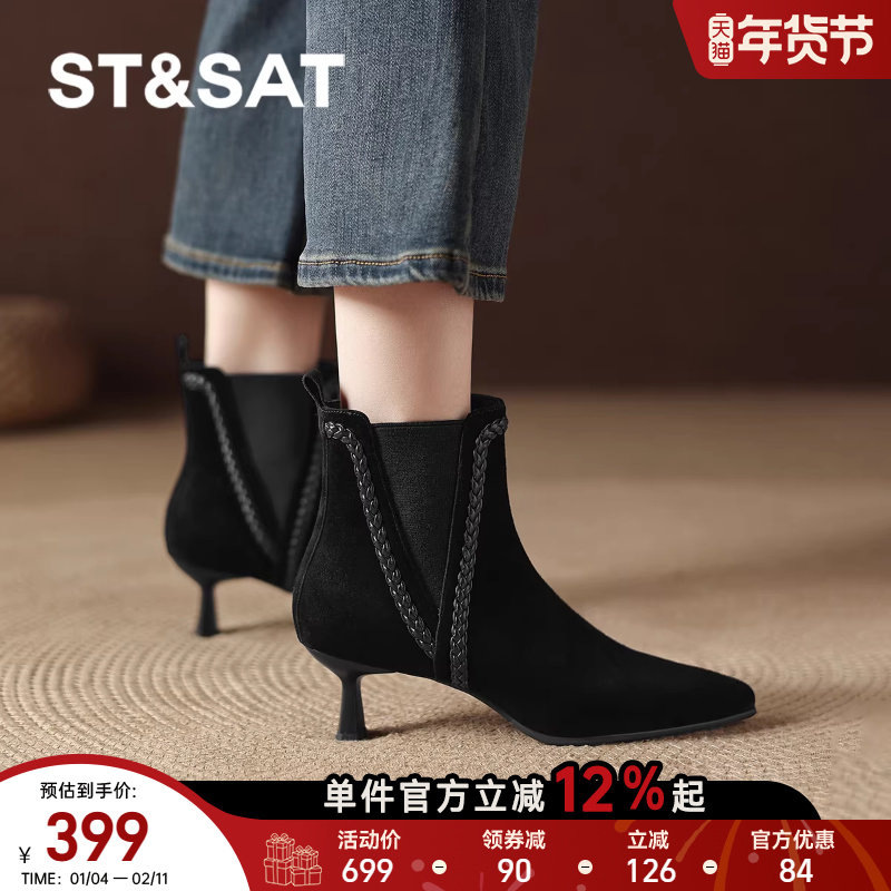 星期六2025冬季新款细跟绒面时装短靴尖头不累脚复古高跟通勤女鞋