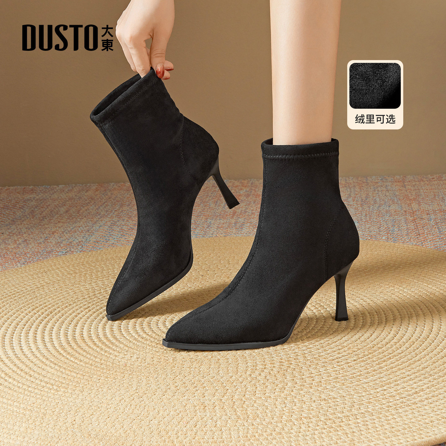大东袜靴女鞋2025年冬季新款细跟高跟尖头优雅短靴加绒保暖时装靴