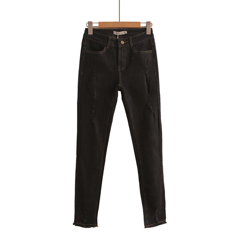 黑色破洞牛仔小脚裤女早秋新款高腰显瘦弹力紧身毛边九分铅笔裤子