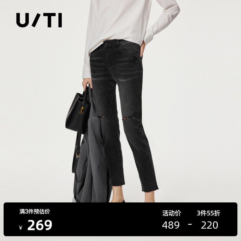U/TI深灰色小狗破洞铅笔裤女百搭修身简约小脚裤尤缇时尚秋季新款