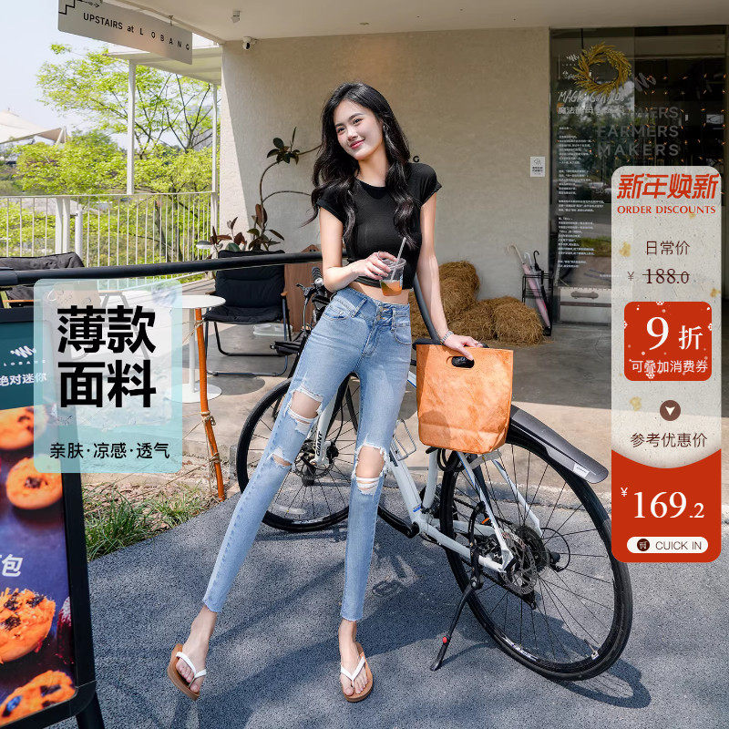 2025夏季薄款大破洞小脚牛仔裤女浅蓝色两粒扣高腰修身显瘦铅笔裤