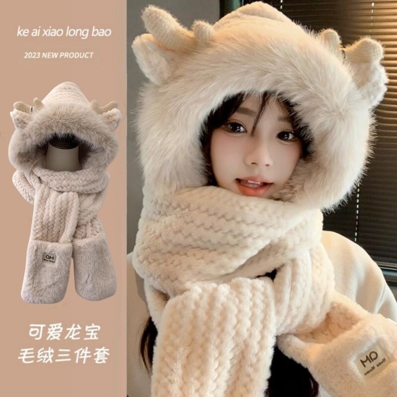鹿角帽子秋冬季百搭女可爱毛绒围巾手套连帽保暖围脖一体三件套厚