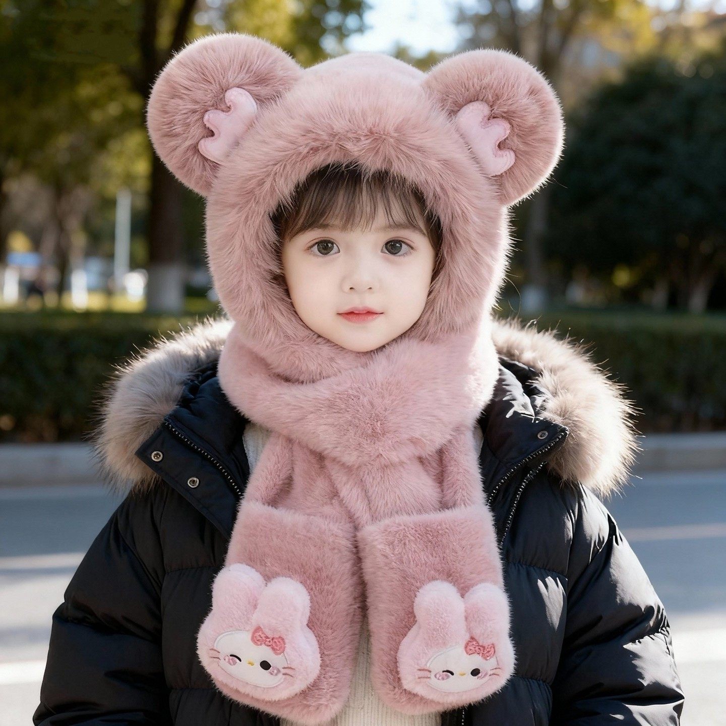 儿童帽子围巾手套冬季可爱一体帽宝宝毛绒三件套男孩女童加厚保暖