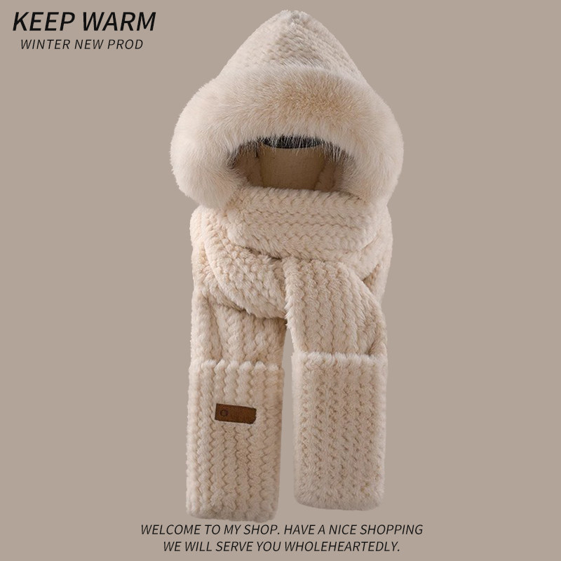 围巾帽子手套一体女连帽冬季帽可爱保暖围脖毛绒冬天三件套厚防寒