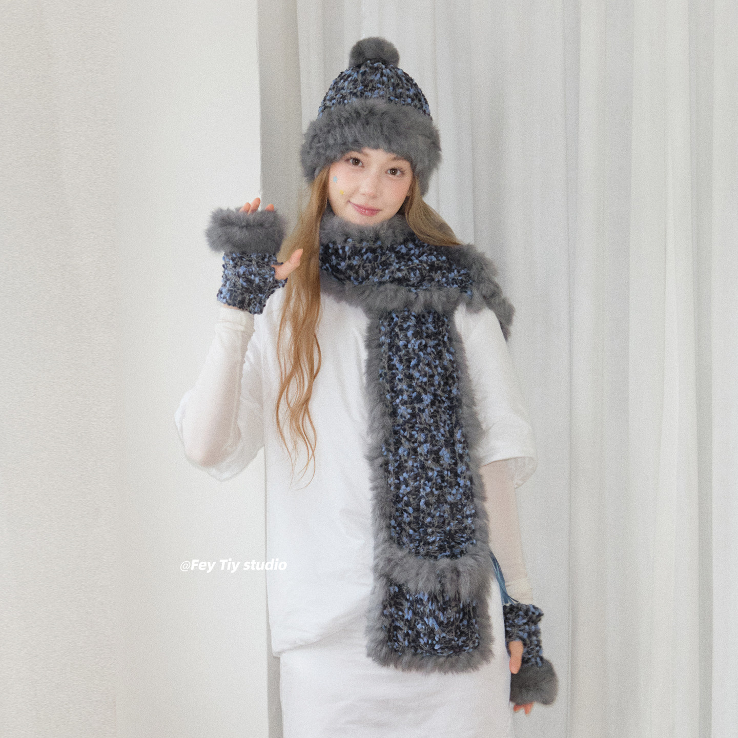 feytiy 纯手工钩织兔毛绒帽子围巾手套三件套女 冬季保暖加厚套装