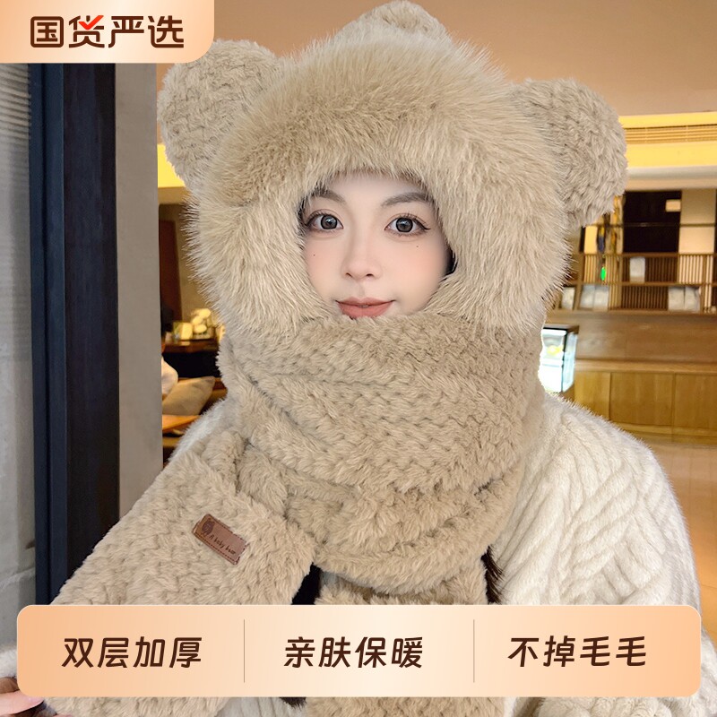 毛绒小熊帽子围巾一体女款2026新款秋冬季手套连帽围脖骑行三件套