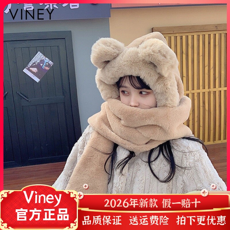 Viney围巾帽子女2026新款冬毛绒可爱小熊手套三件套连帽一体围脖