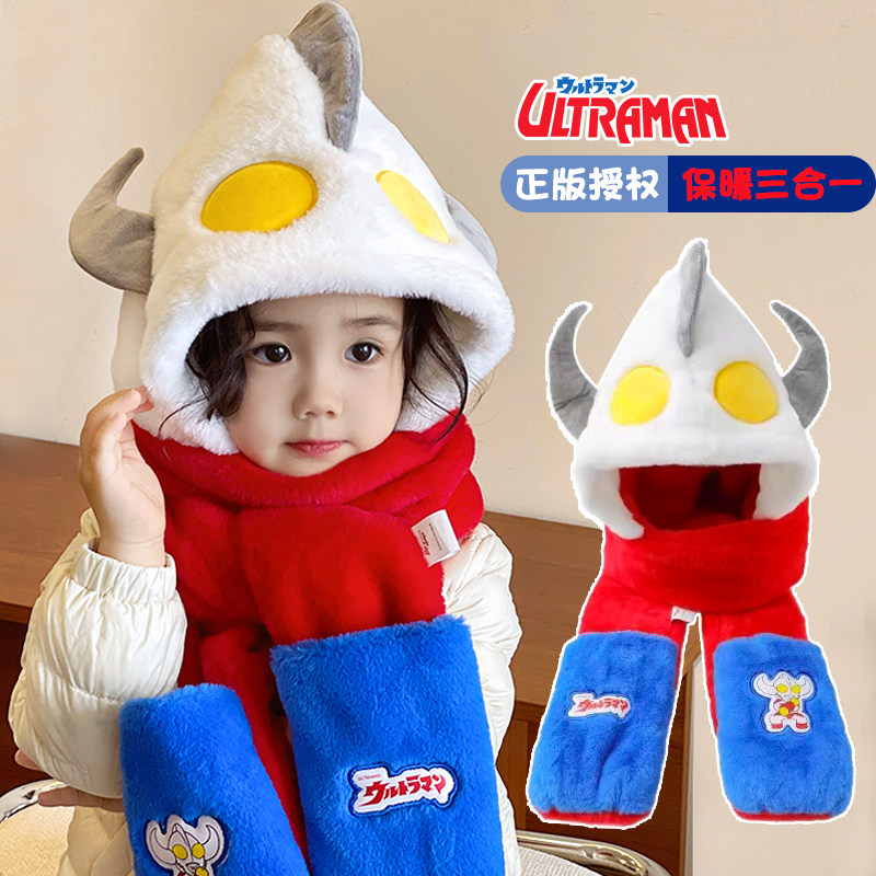 奥特曼儿童帽子围巾手套三件套冬季男孩女童一体帽宝宝防风护耳帽