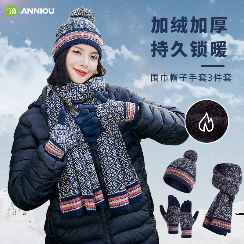 帽子围巾手套三件套女秋冬户外骑车加绒加厚保暖针织帽触屏手套男